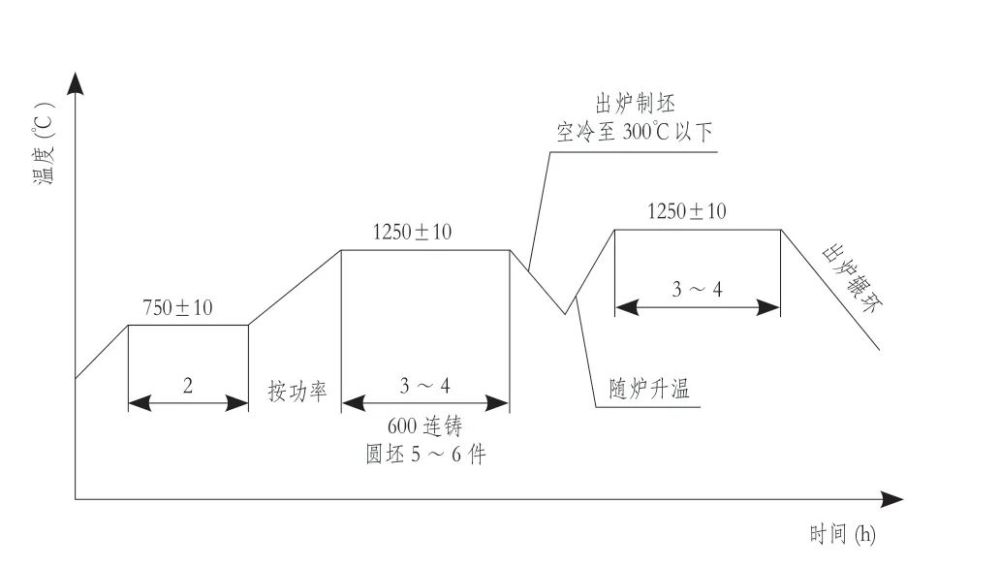 由于法兰工作环境为野外,长期在65 ~85m 高处经受拉伸、弯曲及剪切等作用力,所以法兰一般需要锻造生产。锻造能消除金属在冶炼过程中产生的铸态疏松等缺陷,优化微观组织结构,同时保存了完整的金属流线。该法兰的锻造工艺流程为:下料镦粗平整滚圆冲孔平整辗环。材料牌号为Q345E-Z35;材料规格为φ600mm 连铸坯;下料长度为1646mm,下料重量为3654kg;材料利用率为93.3%,冲孔直径为φ280mm。加热工艺如图1 所示。