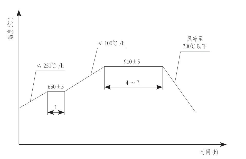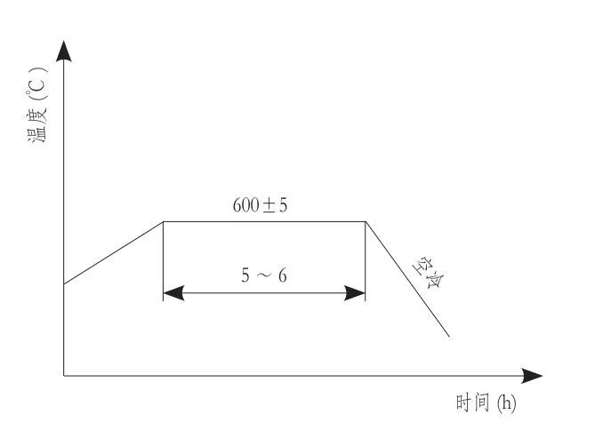 热处理方法为正火和回火。正火的主要目的是使晶粒细化和碳化物分布均匀化,改善钢的性能,获得接近平衡状态的组织。回火的目的是减小或消除工件的内应力,降低钢的脆性,使工件获得较好的强度、韧性、塑性、弹性等综合力学性能。本例法兰正火工艺如图2 所示,回火工艺如图3 所示。法兰经锻造及热处理后硬度、拉伸、冲击、晶粒度、UT 检验等均达到用户要求。