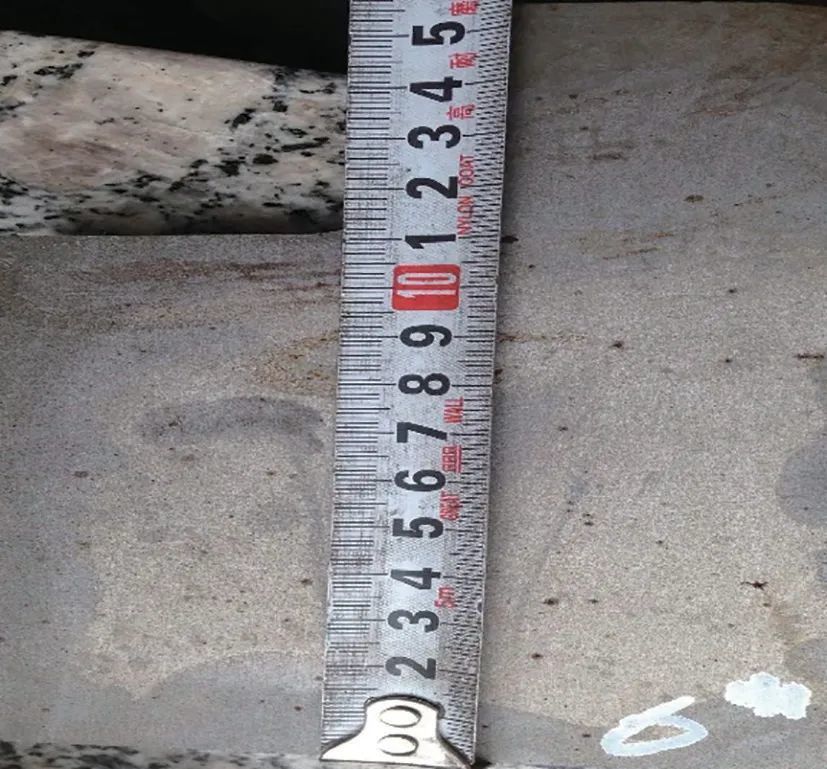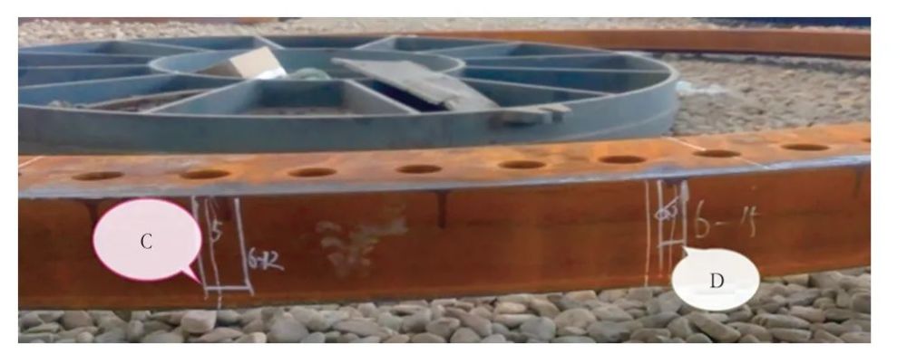 为确定缺陷位置,在法兰下端面(法兰脖颈对面)进行探伤检验,用φ10mm 双晶探头,频率4MHz,发现在法兰高140mm 处,有一条沿圆周А ~В 方向连续条状缺陷,长约1300mm,深度6 ~20mm,如图4 所示。C 点有一单点缺陷,与А、В 缺陷相同;D 点有一单点缺陷,φ2mm,位于法兰端面,距离内径80mm 处,深度6 ~15mm。C、D 点缺陷如图5所示。